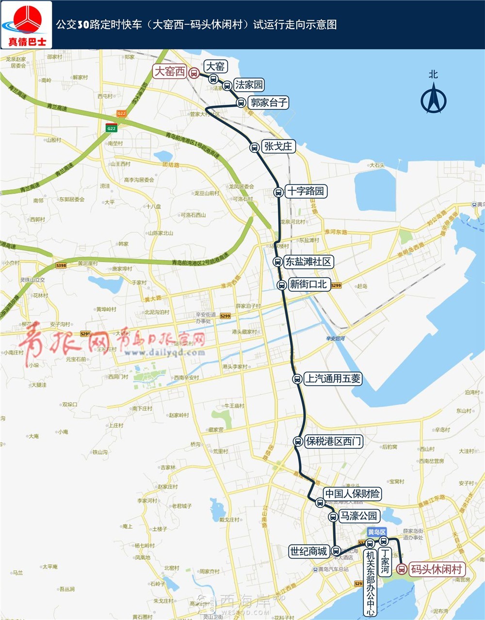 1、发车时间: 7:10福瀛装饰城发往唐岛湾小区。 2、线路走向:由福瀛装饰城站发车,经开拓路、前湾港路、团结路、嘉陵江路、太行山路、香江路、井冈山路、长江路、太行山路至唐岛湾小区站。 3、停靠站点(共11处):福瀛装饰城、辛安北、辛安东、东小庄小区、台头小学、蜊叉泊、中国人保财险、世纪商城、家佳源、黄岛汽车总站、唐岛湾小区。(同15路站点。) 六、公交30路定时快车
