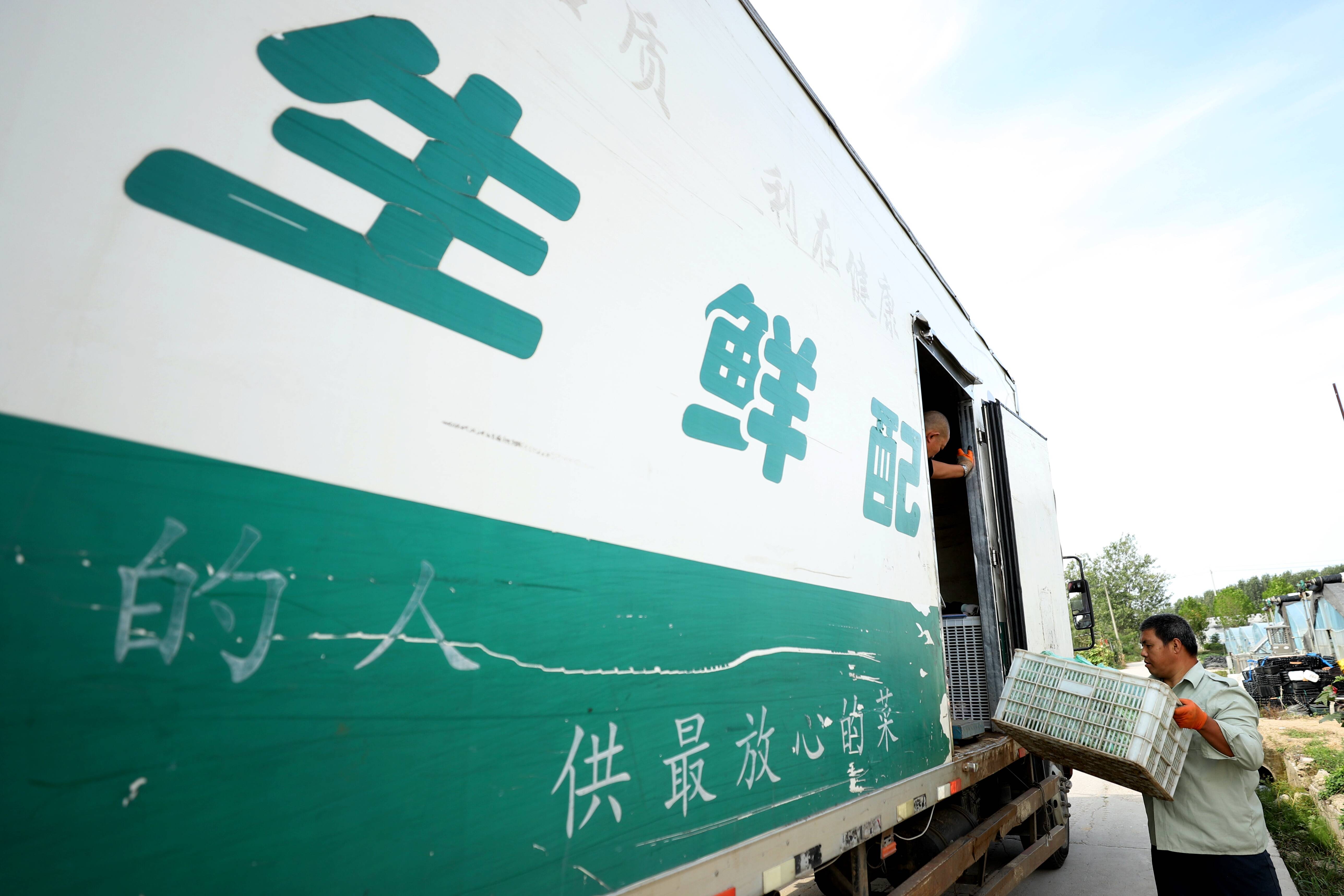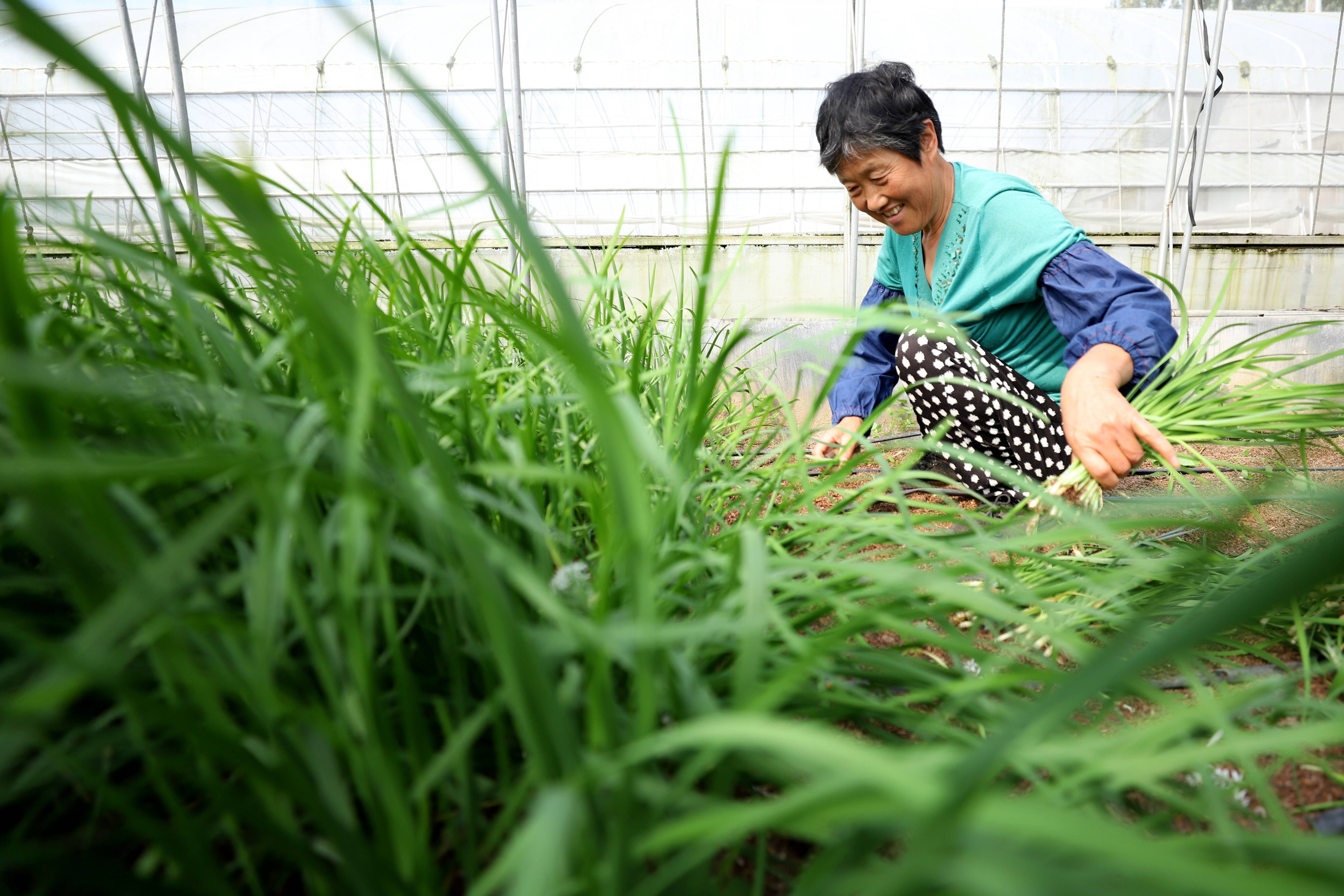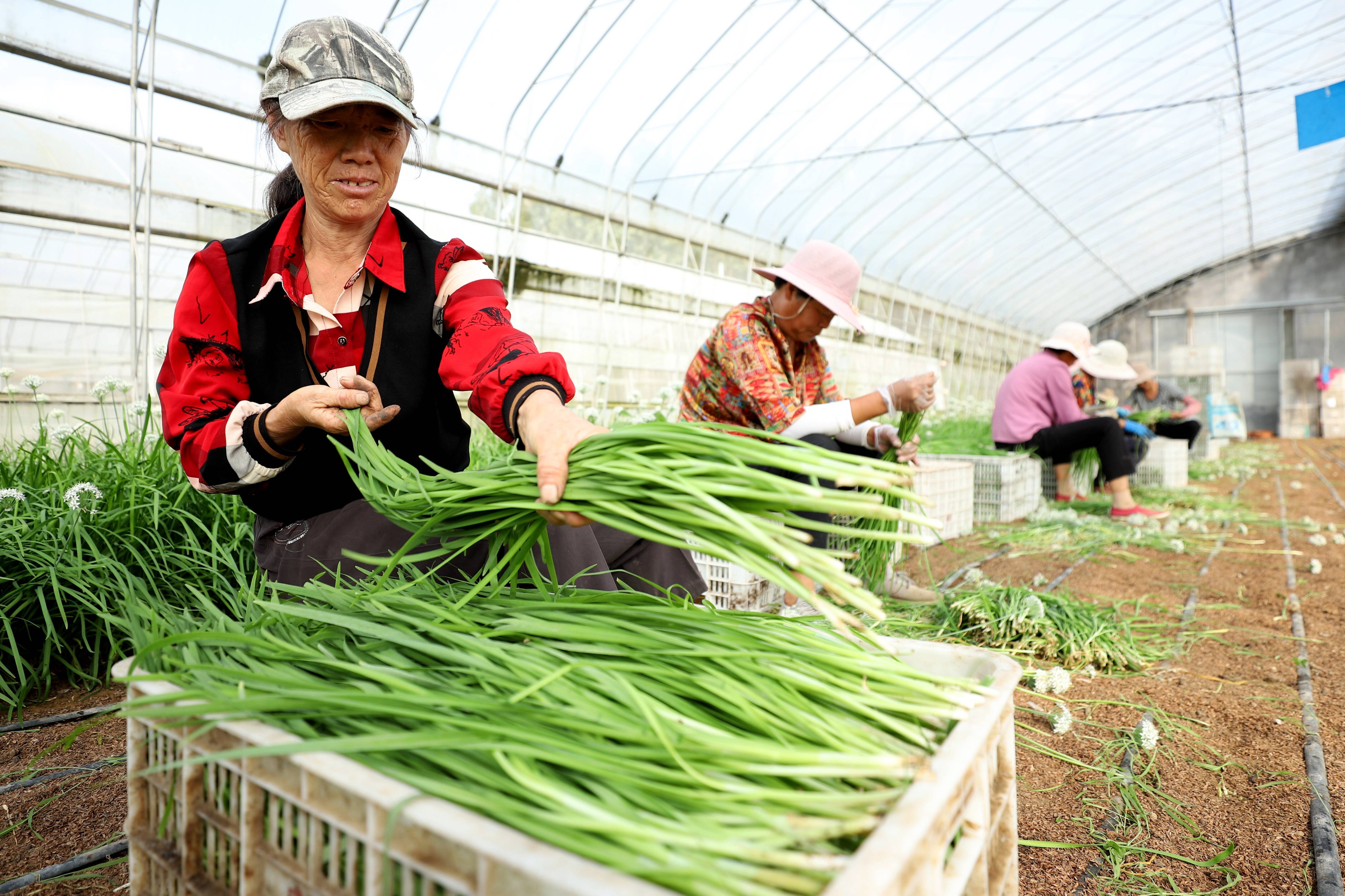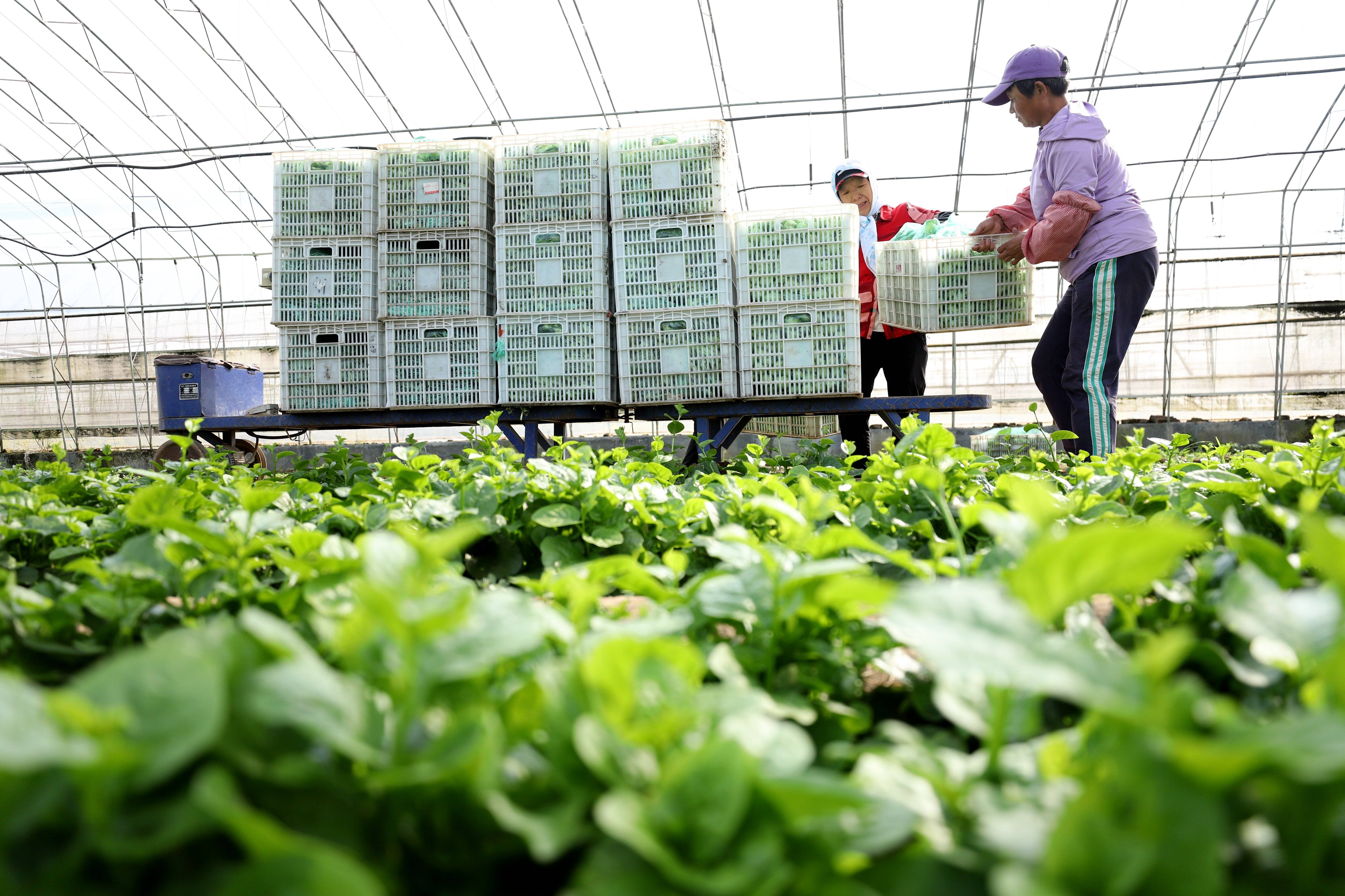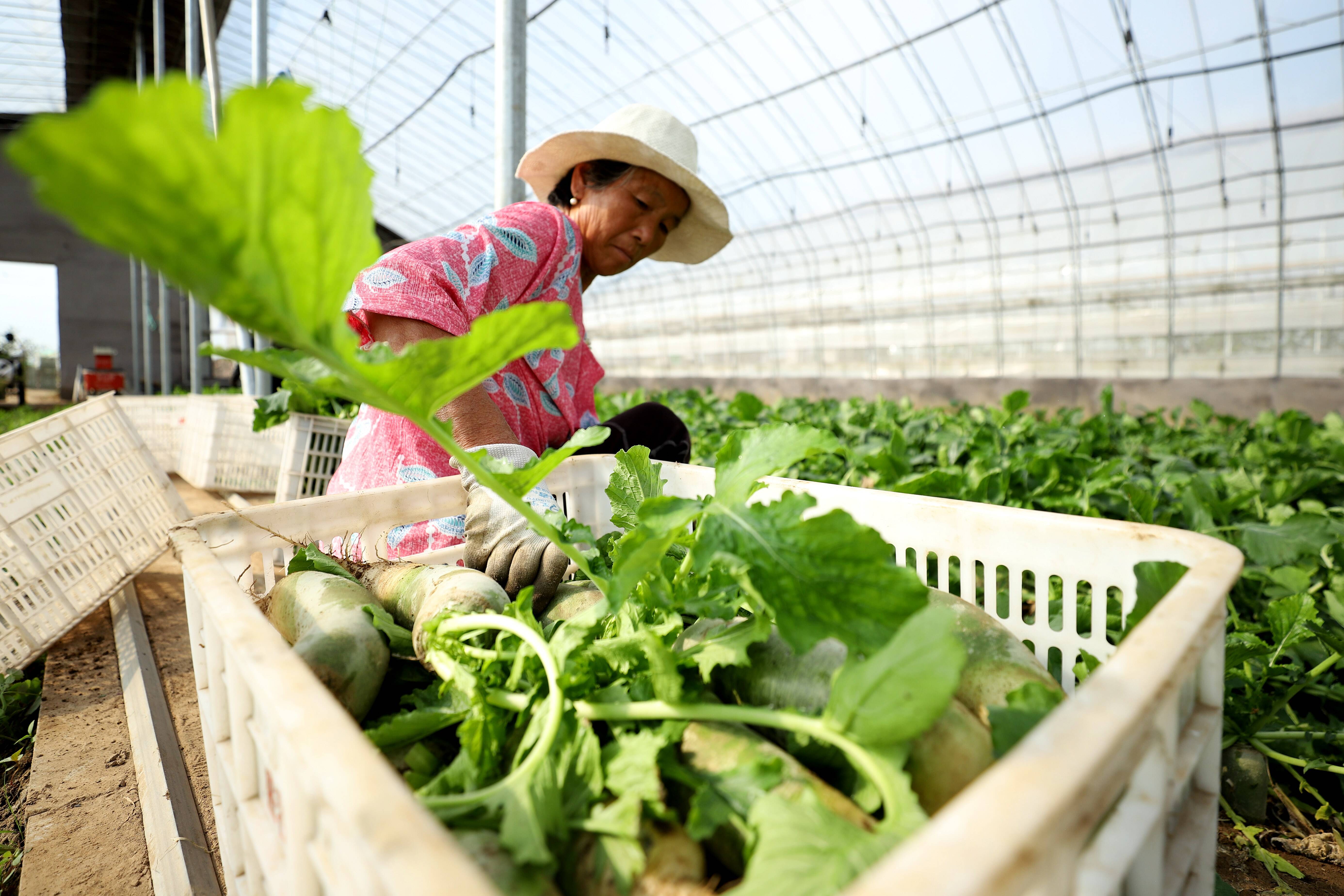 9月22日,在青岛盛客隆现代农业基地,农民在大棚内收获蔬菜。