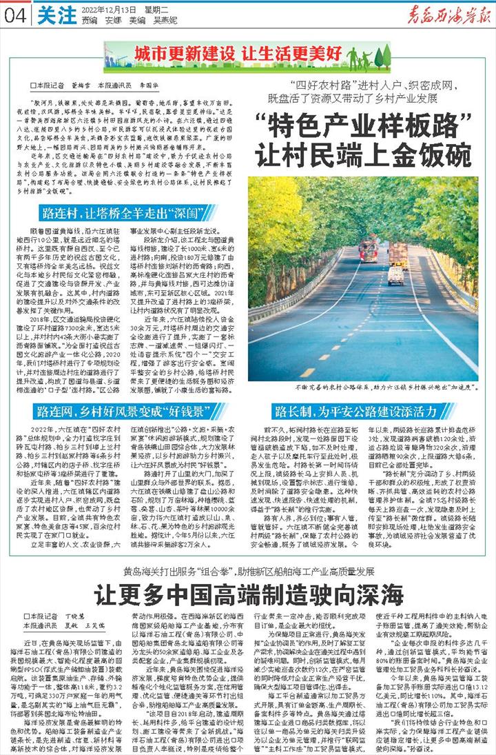 “胶河月,铁橛泉,处处都是采摘园。葡萄香,地瓜甜,喜望丰收万亩田。祝兹情,汉风游,塔桥全羊味美鲜。羊咩咩,民宿歇,露营星空觅神仙。”这是一首赞美西海岸新区六汪镇乡村田园旅游风光的小诗。在六汪镇,通过四通八达、连接四里八乡的乡村公路,市民游客可以沉浸式体验这里的祝兹古国文化,品尝塔桥全羊美食,采摘吾彩宝实蓝莓,泡饮铁橛悬泉绿茶。广袤的田野大地上,一幅因路而兴、因路而美的乡村振兴绚丽画卷铺陈开来。 ▲不断完善的农村公路体系,助力六汪镇乡村振兴跑出“加速度”。 近年来,区交通运输局在“四好农村路”建设中,致力于促进农村公路与农业产业、文化旅游以及特色小镇、美丽乡村建设等融合发展,不断丰富农村公路服务功能。该局会同六汪镇联合打造的一条条“特色产业样板路”,构建起了布局合理、快捷通畅、安全绿色的农村公路体系,让村民捧起了乡村旅游“金饭碗”。 顺着国道黄海线,沿六汪镇驻地西行10公里,就是远近闻名的塔桥村。这里既有源自西汉、至今已有两千多年历史的祝兹古国文化,又有塔桥烤全羊美名远扬。祝兹文化与本地乡村民俗文化紧密相融,促进了交通建设与资源开发、产业发展有机融合。这其中,村内道路的建设提升以及对外交通条件的改善发挥了关键作用。 2018年,区交通运输局投资硬化建设了环村道路7300余米,宽达5米以上,并对村内42条大街小巷实施了沥青路面铺筑。“为全面打造祝兹古国文化旅游产业一体化公路,2020年,我们对塔桥村进行了专项规划设计,并对连接周边村庄的道路进行了提升改造,构成了国道与县道、乡道相连通的‘口子型’连村路。”区公路事业发展中心副主任段新龙说。 段新龙介绍,该工程北与国道黄海线相接,建设了长1000米、宽6米的进村路;向南,投资180万元修建了由塔桥村连接刘新村的沥青路;向西,高标准硬化连接吕家大庄村的沥青路,并与黄海线对接,西可达潍坊诸城市,东可至新区核心区域。2021年又提升改造了进村路上的3座桥梁,让村内道路状况有了明显改观。 近年来,六汪镇陆续投入资金30余万元,对塔桥村周边的交通安全设施进行了提升,实施了一套标志牌、一道减速带、一组爆闪灯、一处语音提示系统“四个一”交安工程,增强了游客出行安全感。宽阔平整安全的乡村公路,给塔桥村民带来了更便捷的生活服务圈和经济发展圈,铺就了小康生活的富裕路。 2022年,六汪镇在“四好农村路”总体规划中,全力打造找字庄到砖瓦屯村路、柏乡三村到埠上兰村路、柏乡三村到赵家村路等6条乡村公路,对辖区内的店子桥、找字庄桥和杨家屯桥等3座桥梁进行了重建。 近年来,随着“四好农村路”建设的深入推进,六汪镇辖区内道路逐步实现进村入户、织密成网,既盘活了农村地区资源,也带动了乡村产业发展。目前,全镇共有特色农家宴、特色美食店等45家,百余位村民实现了在家门口就业。 立足丰富的人文、农业资源,六汪镇创新推出“公路+文旅+采摘+农家宴”休闲旅游新模式,规划建设了青岛铁橛山田园综合体,大力发展林果经济,以乡村旅游助力乡村振兴,让六汪好风景成为村民“好钱景”。 路通打开了山里的大门,加深了山里群众与外部世界的联系。据悉,六汪镇在铁橛山修建了盘山公路和石阶,规划了万亩林海,种植樱桃、蓝莓、桑葚、山杏、茶叶等林果10000余亩,致力将六汪镇打造成以山、泉、林、石、花、果为特色的乡村旅游观光胜地。据统计,今年5月份以来,六汪镇共接待采摘游客2万余人。 前不久,柘涧村路长在巡路至柘涧村北路段时,发现一处路面因下设管涵破损造成下陷,如不及时处理,老人孩子以及摩托车行至此处时,极易发生危险。村路长第一时间将情况上报,镇级路长马上安排人员、机械到现场,设置警示标志、进行维修,及时消除了道路安全隐患。这种快速发现、快速报告、快速处理的机制,得益于“路长制”的推行实施。 路有人养,养必到位;事有人管,管就管好。六汪镇不断健全完善镇村两级“路长制”,保障了农村公路的安全畅通,服务了镇域经济发展。今年以来,两级路长巡路累计排查危桥3处,发现道路病害破损120余处,清运占路垃圾等障碍物320余次,清理道路晒粮90余次,上报道路大修6条,目前已全部处置完毕。 “路长制”充分调动了乡、村两级干部和群众的积极性,形成了权责清晰、齐抓共管、高效运转的农村公路管理养护体制。全镇75名村级路长每天上路巡查一次,发现隐患及时上传至“路长制”微信群。镇级路长随即安排现场处理,杜绝发生道路安全事故,为镇域经济社会发展营造了优良环境。 (青岛西海岸新区融媒体中心出品) |