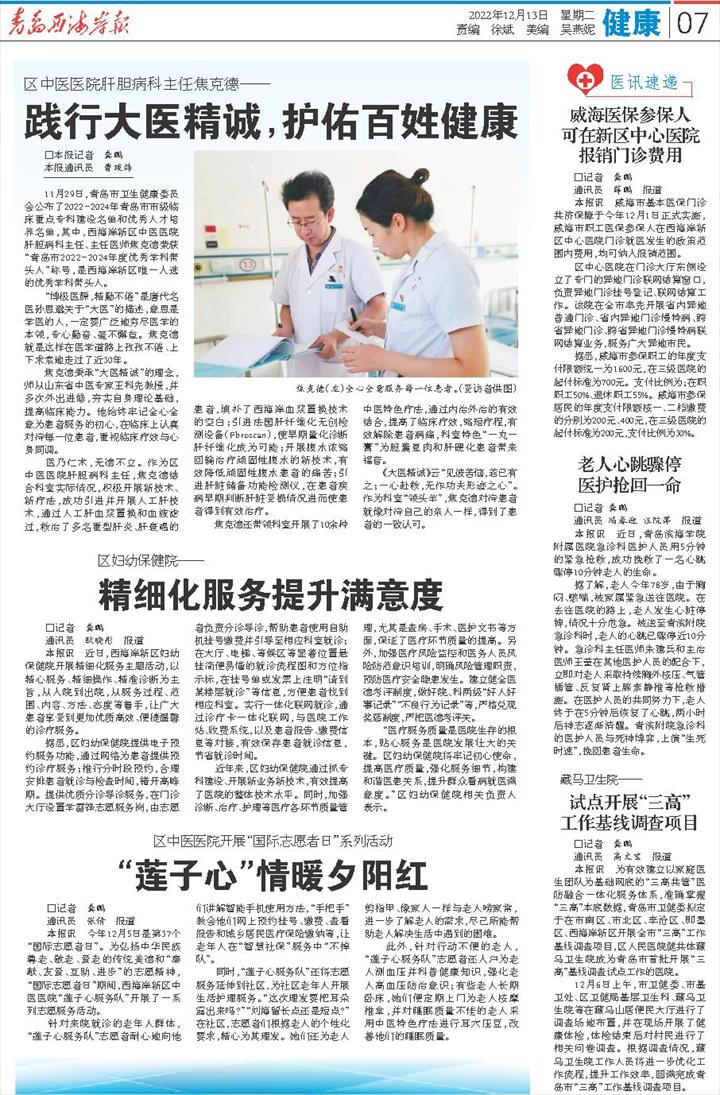 11月29日,青岛市卫生健康委员会公布了2022-2024年青岛市市级临床重点专科建设名单和优秀人才培养名单,其中,西海岸新区中医医院肝胆病科主任、主任医师焦克德荣获“青岛市2022-2024年度优秀学科带头人”称号,是西海岸新区唯一入选的优秀学科带头人。 ▲焦克德(左)全心全意服务每一位患者。(受访者供图) “博极医源,精勤不倦”是唐代名医孙思邈关于“大医”的描述,意思是学医的人,一定要广泛地穷尽医学的本领,专心勤奋、毫不懈怠。焦克德就是这样在医学道路上孜孜不倦、上下求索地走过了近30年。 焦克德秉承“大医精诚”的理念,师从山东省中医专家王科先教授,并多次外出进修,夯实自身理论基础,提高临床能力。他始终牢记全心全意为患者服务的初心,在临床上认真对待每一位患者,重视临床疗效与心身同调。 医乃仁术,无德不立。作为区中医医院肝胆病科主任,焦克德结合科室实际情况,积极开展新技术、新疗法,成功引进并开展人工肝技术,通过人工肝血浆置换和血液滤过,救治了多名重型肝炎、肝衰竭的患者,填补了西海岸血浆置换技术的空白;引进法国肝纤维化无创检测设备(Fbroscan),使早期量化诊断肝纤维化成为可能;开展腹水浓缩回输治疗顽固性腹水的新技术,有效降低顽固性腹水患者的痛苦;引进肝脏储备功能检测仪,在患者疾病早期判断肝脏受损情况进而使患者得到有效治疗。 焦克德还带领科室开展了10余种中医特色疗法,通过内治外治的有效结合,提高了临床疗效,缩短疗程,有效解除患者病痛,科室特色“一丸一膏”为胆囊息肉和肝硬化患者带来福音。 《大医精诚》云“见彼苦恼,若已有之;一心赴救,无作功夫形迹之心”。作为科室“领头羊”,焦克德对待患者就像对待自己的亲人一样,得到了患者的一致认可。 (青岛西海岸新区融媒体中心出品) |