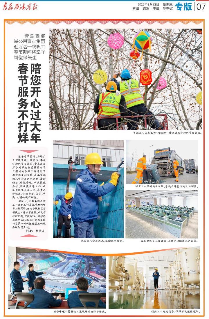 兔年春节临近,为给广大市民营造干净整洁、喜庆祥和的节日氛围,青岛西海岸公用事业集团提前对节日期间的各项工作进行了周密部署和安排,在春节期间扎实开展供水供热、清扫保洁、垃圾清运、市政设施养护、景观亮化等工作,确保市民喝上放心水,享受达标供热,体验整洁、优美、明亮、文明的城市环境。 据统计,公用集团近万名一线职工将在春节期间坚守工作岗位,全力护航新区各项民生工作正常开展。市民有任何问题,可拨打24小时值班热线电话85112319,公用集团将在第一时间把有温度的服务送到您身边。 ▲市政工人正在装饰“网红街”,营造喜庆祥和的节日氛围。 ▲水务工人清洗滤池,保障供水质量。 ▲环卫工人及时清运垃圾,营造干净整洁的生活环境。 ▲客服热线全天候在线,及时受理解决用户诉求。 ▲安全管理人员抽检工地现场安全防护情况。 ▲供热工人巡检设备,保障市民温暖过年。 ▲锅炉工作人员认真监盘,密切关注设备运行参数 ▲能源供热公司的巡线工作人员在给热力管线巡检“听诊” ▲能源供热公司依托智慧平台精准调温 ▲市政工人正在检修路灯 ▲绿化工人齐心协力清理广场枯枝杂草 ▲小型机扫车与环卫工人齐上阵,保障公园广场环境整洁 ▲水质检测员进行水样化验 ▲供水调度员时刻关注各生产单元运行状态 ▲水务公司运行管理人员查看供水设施运行情况 (青岛西海岸新区融媒体中心出品) |