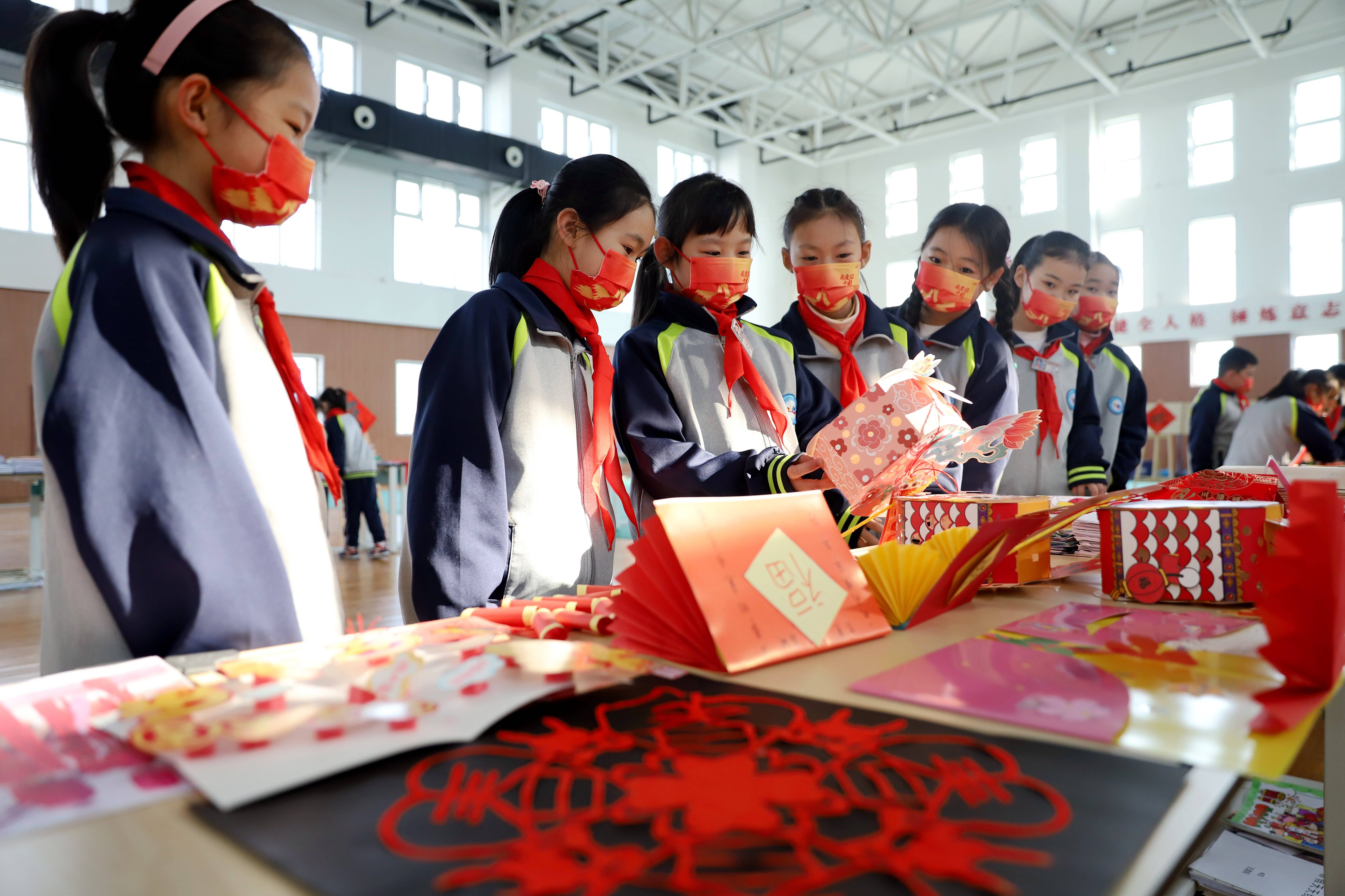 2月6日,在青岛西海岸新区第二实验小学,学生参观寒假课程成果展。