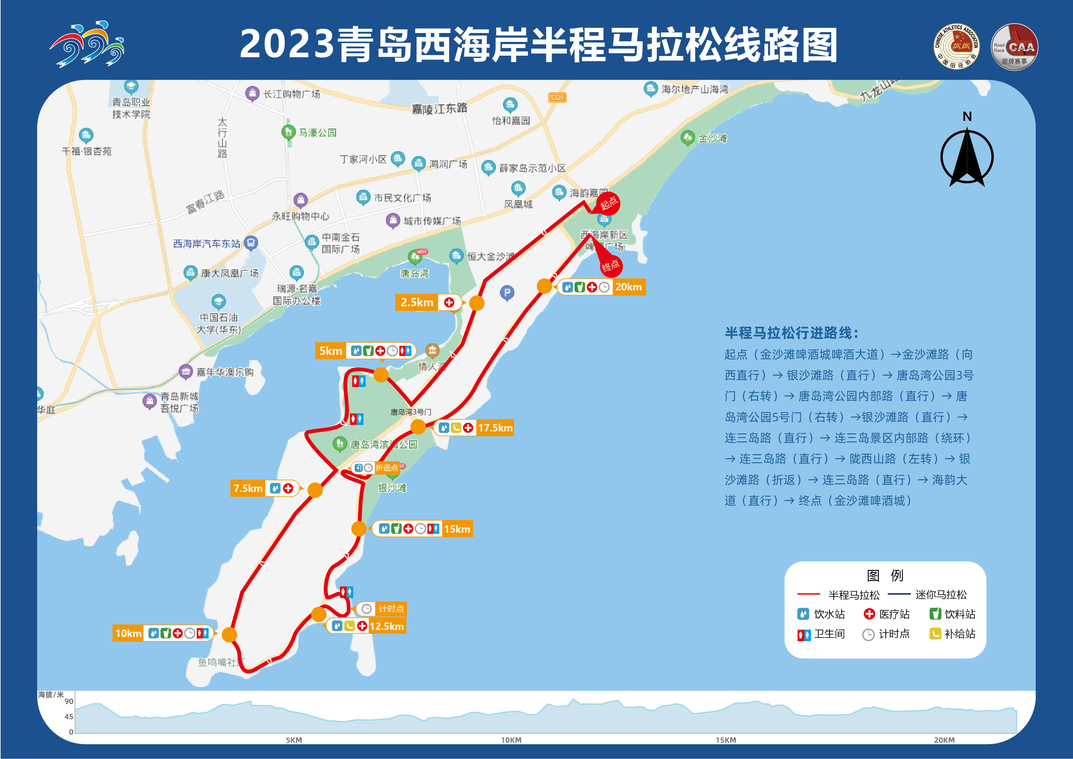 本次赛事分为半程马拉松和5km健康跑两个组别。其中,半程马拉松参赛规模7000人,5km健康跑参赛规模3000人,总计参赛规模1万人。 赛事路线沿用西海岸半马经典赛道,将金沙滩啤酒城、唐岛湾公园、鱼鸣嘴景区、银沙滩风景区、连三岛景区等城市生态景观联结起来,依托山海环绕的城市公园布局,穿越新区旅游度假核心地点,让参赛选手在奔跑中饱览新区的风光魅力和人文风情,感受新区绿色生态的宜居宜业环境。 据悉,半程马拉松自金沙滩啤酒城出发,先后沿金沙滩路、银沙滩路、连三岛路绕西环岛一周返回,沿海韵大道向东,最终冲刺至终点;5km健康跑自金沙滩啤酒城啤酒大道起跑,沿金沙滩路向西至青云山路路口折返,经天目山路、啤酒城西门、海韵支路和海韵大道至凤凰之声大剧院西侧上石雀山环山路,面向终点冲刺。