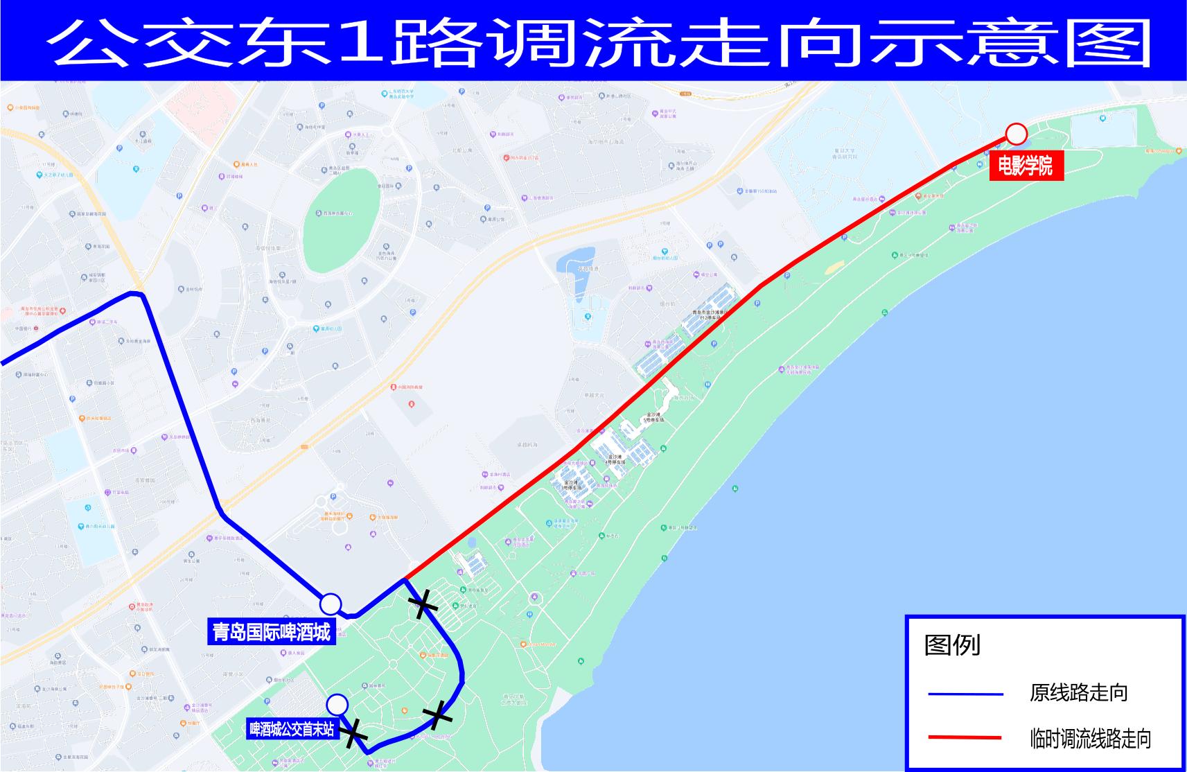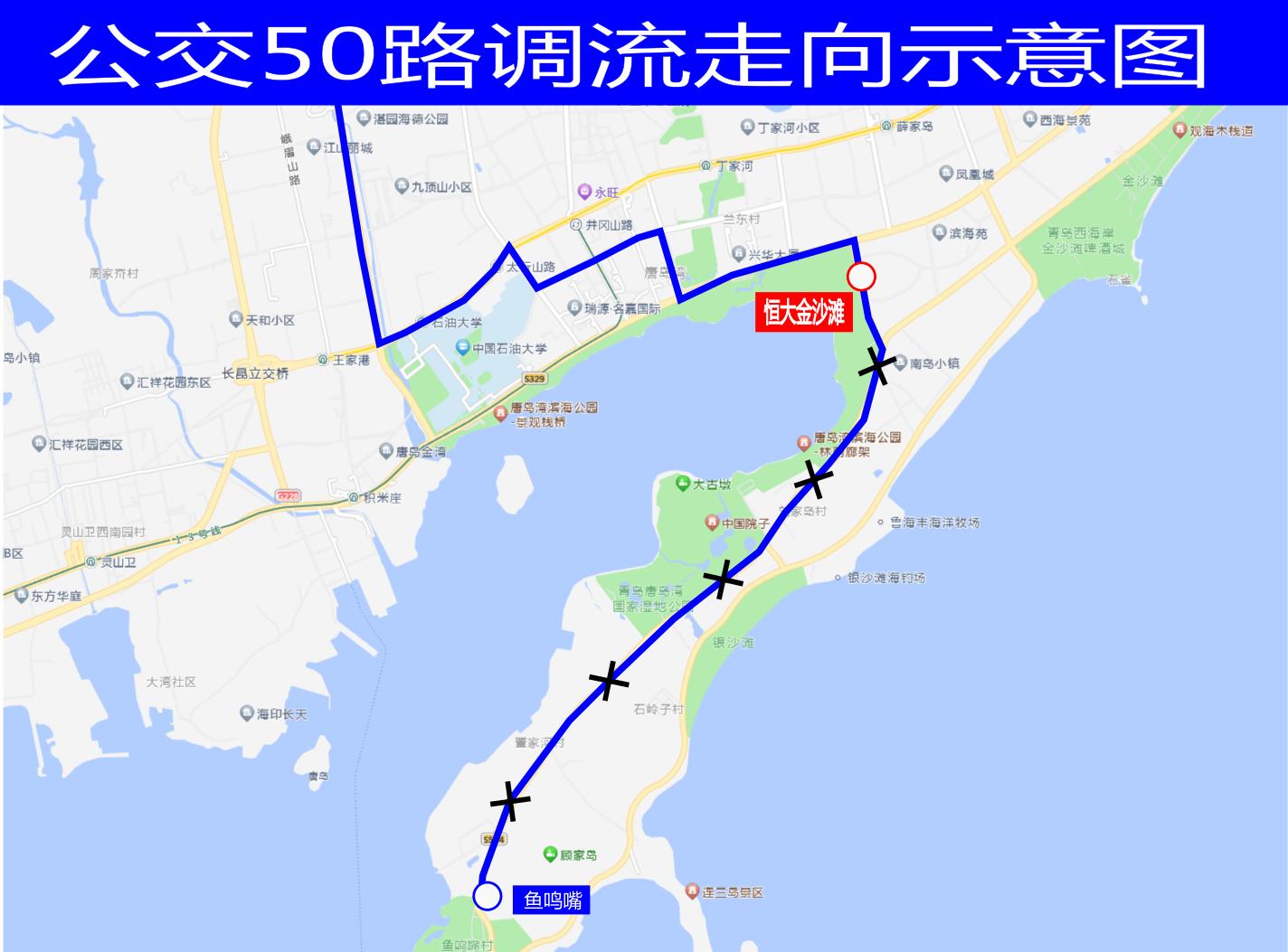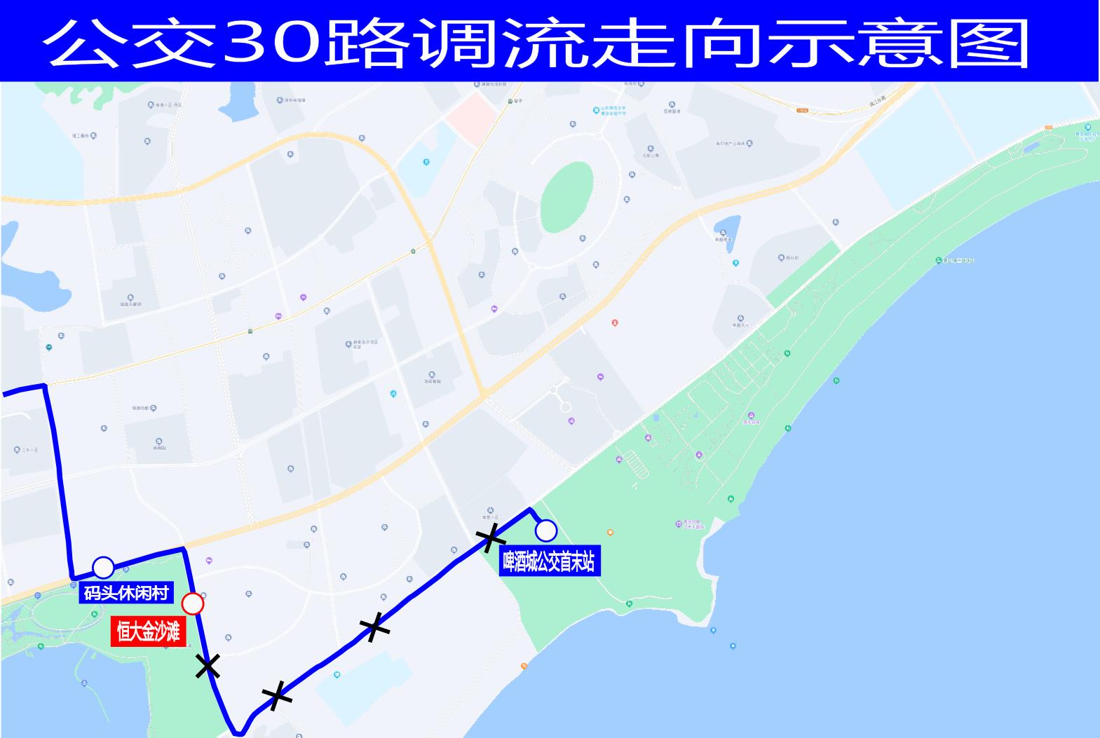 (一)公交东1路(黄岛轮渡-青岛国际啤酒城啤酒大道) 线路走向:交通管制期间,由黄岛轮渡发车按原线路运行至青岛国际啤酒城站后,经嘉陵江东路、金沙滩路到达电影学院;回程同调流线路运行。 站点设置:临时取消青岛国际啤酒城音乐大道、青岛国际啤酒城啤酒大道、啤酒城公交首末站(发往黄岛轮渡方向),共3处站点;临时增设金沙滩西、金沙滩、烟台前、复旦大学青岛研究院、电影学院,共5处站点。 线路临时调流走向图: (二)公交东3路(海尔信息谷-银沙滩西) 线路走向:交通管制期间,由海尔信息谷站发车按原线路运行至中联运动公园站后,经漓江西路、罗浮山路到达恒大金沙滩站;回程同调流线路运行。 站点设置:临时取消青云山路漓江西路(发往银沙滩方向)、齐鲁第一实验小学、南岛小镇东、南岛小镇、唐岛湾国家湿地公园观景亭、东方贝壳文化博览园、银沙滩东、温德姆至尊酒店、银沙滩北、银沙滩西,共10处站点;临时增设恒大金沙滩(同50路)1处站点;发往海尔信息谷方向漓江西路青云山路调整至漓江西路(同31路)停靠。 线路临时调流走向图: (三)公交4路(薛家岛公交枢纽站-灵山卫公交枢纽站) 线路走向:交通管制期间,由薛家岛公交枢纽站发车按原线路运行至金沙滩西站后,经金沙滩路、嘉陵江东路、漓江东路、天目山路到达中联运动公园站后恢复原线路运行;回程同调流线路运行。 站点设置:临时取消青岛国际啤酒城西、金沙滩壹号小区,共2处站点;临时增设青岛国际啤酒城、海韵嘉园,共2处站点。 线路临时调流走向图: (四)公交30路(大窑西-青岛国际啤酒城西) 线路走向:交通管制期间,由大窑西发车按原线路运行至恒大金沙滩;回程同调流线路运行。 站点设置:临时取消泥布湾、南岛小镇东、西海岸音乐学校、青岛国际啤酒城西、啤酒城公交首末站(始发站),共5处站点。 线路临时调流走向图: (五)公交50路(海尔信息谷-鱼鸣嘴) 线路走向:交通管制期间,终点站由鱼鸣嘴临时调整至恒大金沙滩站。 站点设置:临时取消泥布湾、南岛小镇、唐岛湾国家湿地公园观景亭、东方贝壳文化博览园、银沙滩东、温德姆至尊酒店、银沙滩北、中央美术学院青岛校区、青岛西海艺术湾、陈姑庙、鱼鸣嘴,共11处站点。 线路临时调流走向图: (六)公交808路(薛家岛公交枢纽站-银沙滩北) 线路走向:交通管制期间,由薛家岛公交枢纽站按原线路运行至中联运动公园站后,经天目山路、漓江西路、罗浮山路到达恒大金沙滩站;回程同调流线路运行。 站点设置:临时取消发往银沙滩北方向金沙滩壹号小区、西海岸音乐学校、南岛小镇东、唐岛湾国家湿地公园观景亭、东方贝壳文化博览园、银沙滩东、温德姆至尊酒店;发往薛家岛公交枢纽站方向银沙滩西、银沙滩、海洋牧场、石雀观海驿站、石雀滩;银沙滩北(双向),共13处站点;临时增设漓江西路青云山路(同31路)、恒大金沙滩(同50路),共2处站点。 线路临时调流走向图: (七)公交809路(薛家岛地铁站-海洋牧场) 线路走向:交通管制期间,由薛家岛地铁站站发车按原线路运行至青云山路漓江西路站后,经青云山路、漳江路、罗浮山路到达恒大金沙滩站;回程由恒大金沙滩站发车经罗浮山路、漳江路到达御海景园站后恢复原线路运行至薛家岛地铁站。 站点设置:临时取消齐鲁第一实验小学、南岛小镇东、南岛小镇、唐岛湾国家湿地公园观景亭、东方贝壳文化博览园、银沙滩东、温德姆至尊酒店、银沙滩北、银沙滩西、温德姆至尊酒店南(发往薛家岛地铁站方向)、银沙滩、海洋牧场,共12处站点;临时增设恒大金沙滩(同50路)1处站点。 线路临时调流走向图: 乘车具体事宜可拨打真情巴士客服热线0532-86851249咨询。