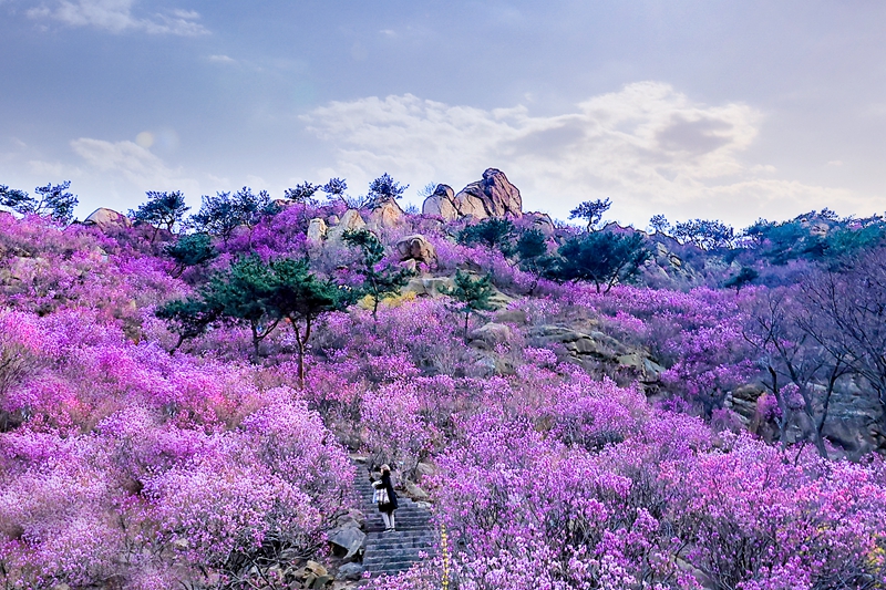 大珠山景区是青岛西海岸最为著名的赏花地,景区自然景观特色突出,向以“谷秀、峰奇、石怪、花繁”著称于世,尤以蔓延珠山秀谷三个山谷的万亩野生杜鹃花最为著名,据大珠山景区工作人员介绍,景区杜鹃花全面盛开时,漫山遍野,红动山川,十分壮观,堪称江北第一赏花奇观。 大珠山的杜鹃花主要有蓝荆子、映山红、崆峒花三个品种,被称为“杜鹃花三姊妹”。根据青岛西海岸新区气象台预报,4月1日前后,开花时间最早、持续时间最长的杜鹃品种“蓝荆子”,将迎来最佳观赏期;4月中旬,更加鲜艳的“映山红”将陆续开放;“崆峒”将在4月下旬迎来盛花期,花期可一直持续到5月初。在此期间,连翘、玉兰、紫藤、蔷薇等鲜花品种都将陆续开放。