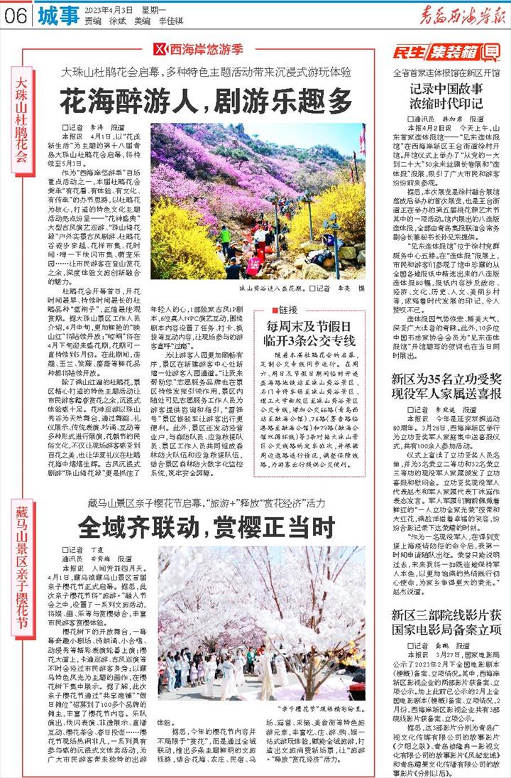4月1日,以“花漾新生活”为主题的第十八届青岛大珠山杜鹃花会启幕,将持续至5月3日。 作为“西海岸悠游季”百场重点活动之一,本届杜鹃花会秉承“有花看、有体验、有文化、有传承”的办节思路,以杜鹃花为核心,打造的特色文化主题活动亮点纷呈——“花神盛典”大型古风演艺巡游、“珠山绮花録”户外实景古风剧游、杜鹃花谷徒步穿越、花样市集、花时间·啤一下快闪市集、萌宠乐园……让市民游客在登山赏花之余,深度体验文旅创新融合的魅力。 杜鹃花会开幕首日,开花时间最早、持续时间最长的杜鹃品种“蓝荆子”,正值最佳观赏期。据大珠山景区工作人员介绍,4月中旬,更加鲜艳的“映山红”将陆续开放;“崆峒”将在4月下旬迎来盛花期,花期可一直持续到5月初。在此期间,连翘、玉兰、紫藤、蔷薇等鲜花品种都将陆续开放。 ▲珠山秀谷进入盛花期。记者 李亮 摄 除了满山红遍的杜鹃花,景区精心打造的特色主题活动让市民游客踏春赏花之余,沉浸式体验感十足。花神巡游以珠山秀谷为天然舞台,通过舞蹈、礼仪展示、传统表演、吟诵、互动等多种形式进行展演,花朝节的民俗文化,不仅让现场游客感受到百花之美,也让华夏礼仪在杜鹃花海中熠熠生辉。古风沉浸式剧游“珠山绮花録”更是抓住了年轻人的心,1部独家古风IP剧本,6位真人NPC演艺互动,围绕剧本内容设置了任务、打卡、换装等互动内容,让现场参与的游客直呼“过瘾”。 为让游客入园更加顺畅有序,景区在新建游客中心处新增一处游客入园通道。“让我来帮助您”志愿服务品牌也在景区持续发挥引领作用,景区内随处可见志愿服务工作人员为游客提供咨询和指引,“雷锋号”景区接驳车让游客出行更便利。此外,景区还发动经营业户,与森防队员、应急救援队员、景区工作人员共同组成森林防火队伍和应急救援队伍,结合景区森林防火数字化监控系统,筑牢安全屏障。
